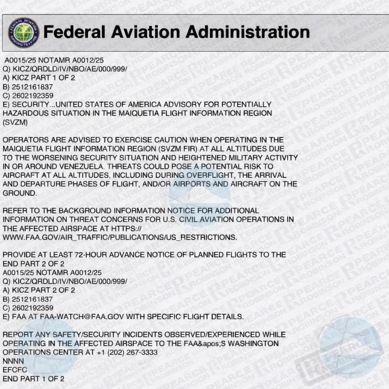 WILLEMSTAD – E autoridad di aviacion di Merca, Federal Aviation Administration (FAA), a (bolbe)declara oficialmente henter e area Venezolano como un area di halto riesgo pa aviacion civil. Den e aviso di seguridad renoba NOTAM A0015/25, e FAA ta indica cu den e Maquetia Flight Information Region, cu ta cubri henter e aira di Venezuela, tin un deterioro claro den seguridad y un aumento evidente di actividad militar. E aviso di seguridad ta valido for di 16 di december 2025 te cu 19 di februari 2026.