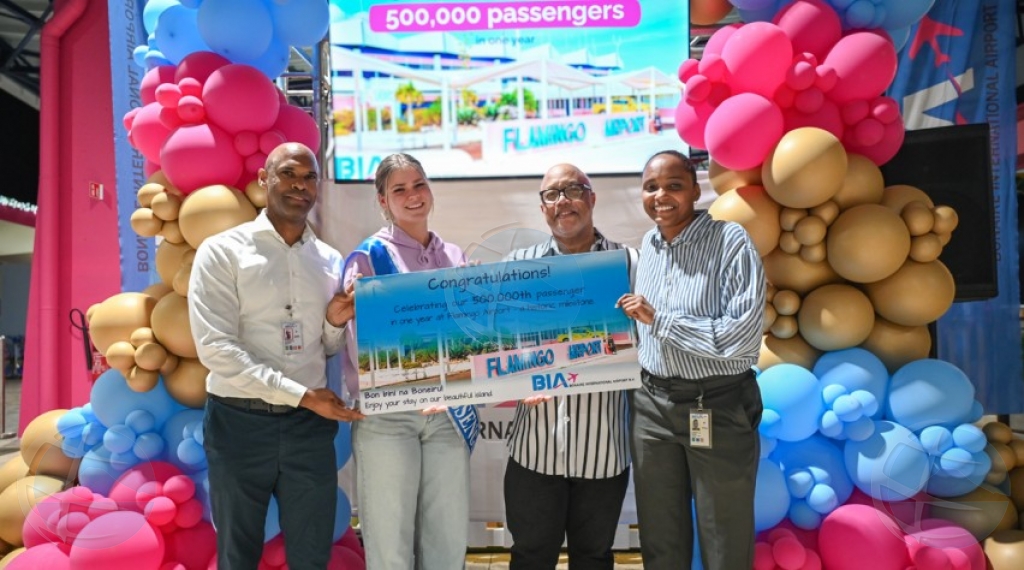 KRALENDIJK - Bonaire International Airport a yega dialuna pa prome biaha den su historia na e punto di 500.000 pasahero den un solo aña. E pasahero en cuestion a yega riba e isla cu un buelo di KLM for di Schiphol, unda nan a ricibi’e cu regalo y bolo. “Yega e limite aki di mei miyon pasahero ta un resultado bunita,” segun Giordano Molina, director operacional di e aeropuerto.
