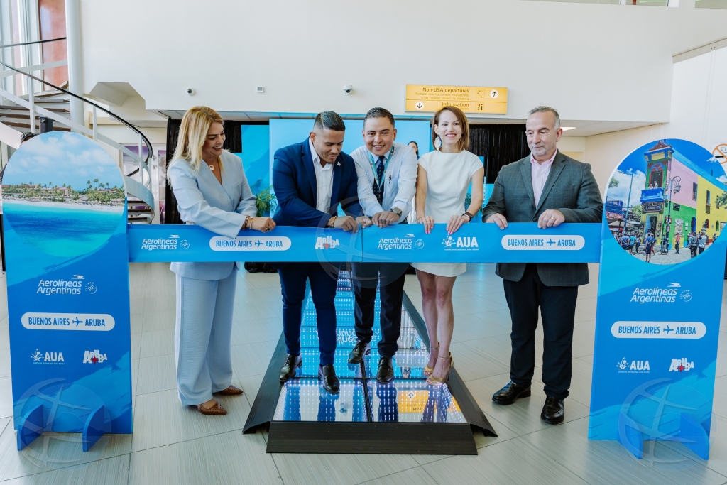 ORANJESTAD - Aerolíneas Argentinas ta lansa servicio directo nobo entre Argentina y Aruba. E vuelo inaugural a sali for di Aeropuerto Internacional Ezeiza (EZE) cu tur 170 asiento completamente ocupa, reflehando e demanda fuerte di mercado y un contesta sumamente positivo di parti di e biaheronan Argentino. Pa celebra formalmente e momento, tabatin un ceremonia inaugural cu a tuma luga riba dia 8 di januari, na Aeropuerto di Aruba, treciendo hunto e stakeholdernan clave di gobierno, aviacion y turismo. E celebracion a conclui cu un ceremonia tradicional di cortamento di cinta y cortamento di bolo, oficialmente yamando bonbini na Aerolíneas Argentinas na Aruba.