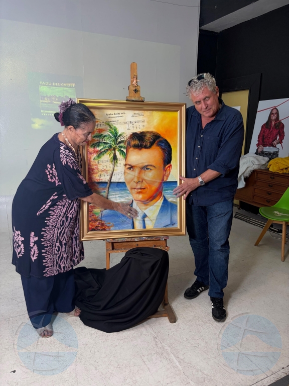 ORANJESTAD – Den un ceremonia informal na Checkpoint Color, artista Peter van den Heuvel, hunto cu Vivian Lampe, a revela un portret conmemorativo di Padu Del Caribe, como parte di celebracion di 50 aña di Aruba Dushi Tera.